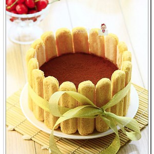 脱模后,在上面洒上可可粉,周围围上手指饼做为装饰就大功告成了。
