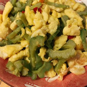 起锅烧油,把小米辣蒜末炒出香味。放苦瓜,炒两分钟,把鸡蛋倒进来一起翻炒一分钟。出锅前加入适量的盐和鸡精调味。盐不要太多,因为鸡蛋里面有盐