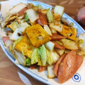 加豆腐,火腿肠。翻炒。