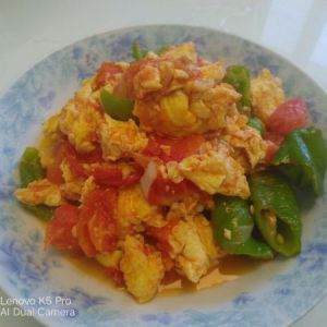 锅加油,炒香小葱,下入西红柿青椒炒出香味