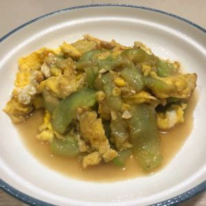 锅刷干净再次倒油,开中大火,油热后放入姜片爆香,然后把丝瓜和蒜蓉一起放入翻炒。如果锅里太干可以稍微加点水,少量多次加,千万不要加多。加入酱油和食盐,待丝瓜完全变软之后放入鸡蛋,炒匀出锅即可