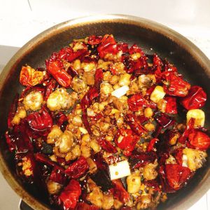 另起锅,加底油烧热,下入葱姜蒜末,下干辣椒和花椒煸出香味。
