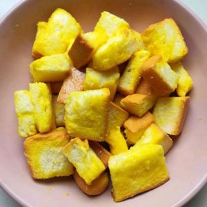 放油热了后,给面包下锅翻炒至鸡蛋烧熟,撒一点盐巴,翻炒均匀