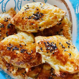 用叉子压紧边缘,压出花边。刷上蛋黄液,撒上黑芝麻