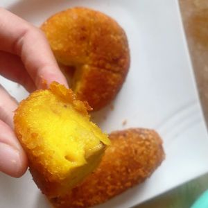 将南瓜团揪起来一块,拍成饼状,在里面放入你喜欢的馅料,我放的是红枣泥和炼乳还有红糖。然后将带馅的南瓜饼捏紧团成球,再捏成你喜欢的形状