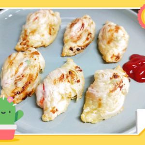 将火腿肠切成长短一样的小段,放入蛋挞皮,然后放入青豆玉米胡萝卜粒,最后加点芝士碎