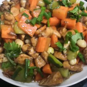 然后先后加入胡萝卜、黄瓜、花生米、干辣椒,继续翻炒均匀,放蚝油和盐调味。(白糖和醋根据个人口味,也可以不放,这里做的没有放。)放一小碗水,焖煮一会收汁。然后加入适量味精。(不吃鸡味精的可以忽略)