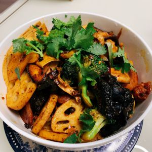 放入全部食材,转大火爆炒至蔬菜全熟后出锅,放入香菜点缀即可
