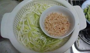 热锅润油,中火下西葫芦炒一分钟,下虾皮(尝尝自己家虾皮是淡的还是咸的),盐,料酒,翻炒