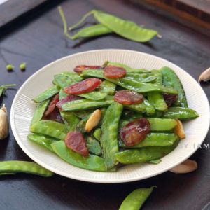 荷兰豆加入锅里中火翻炒至熟,变成深绿色;