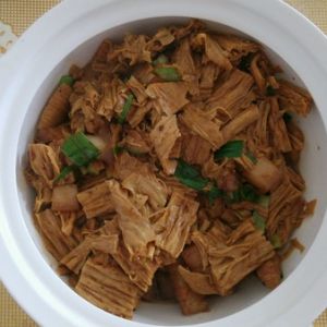 热锅冷油倒入五花肉,炼出其中多余的油份。再倒入腐竹加十三香,酱油,料酒翻炒。
