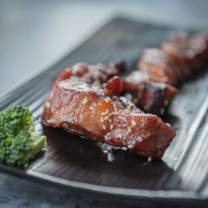 6.继续烘烤10分钟后,打开烤箱给梅花肉刷上蜜糖水(蜂蜜加水1:1混合)
