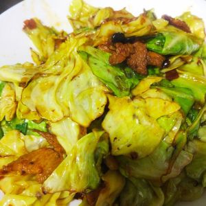 然后放入撕好的包菜,煸炒几下,加入酱油