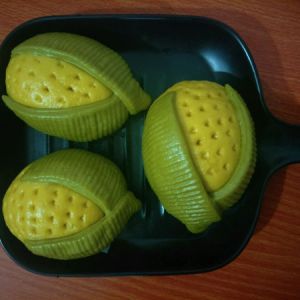 将两种面团进行排气,揉至切面无气孔。将35克黄色面团揉成椭圆形或者水滴状。再将15颗绿色面团用擀面杖擀成圆形,切成两半。用一次性干净梳子或者叉子压成条印,印压深一点,以免发酵蒸熟后就没有印了。再加绿色切口朝上如图,包裹在黄色面团上。用牙签如图在黄色面团上戳一些小孔。