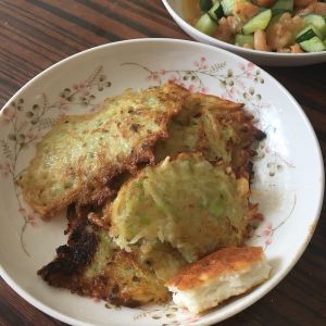 锅中加入油(电饼铛也可以),待油热了以后放入上述材料,煎至金黄翻一面,然后出锅