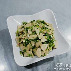 将素鸡、香菜放入大碗中,调入盐、糖、味精和香油。