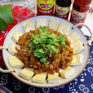 调制鱼香汁:味达美味极鲜酱油2勺+味达美醇香米醋2勺+味达美臻品蚝油1勺+葱伴侣辣黄豆酱1勺,搅拌均匀,再加入盐2克+糖5克+淀粉1勺,加入水约30克搅拌备用;