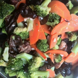 清洗干净所有食材,水发黑木耳和冬菇。胡萝卜切片,西兰花切成一小朵一小朵…