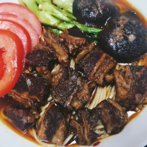 高压锅放葱、姜、老抽、生抽(黑乎乎一坨一坨的就是我的老卤水)加水没过牛腩,压力锅调至“肉类”。