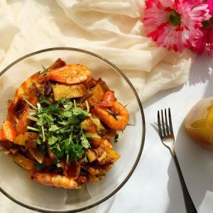 煸炒出香味后,放入土豆,胡萝卜,香芹,开始翻炒,从难熟到易熟的顺序,放入虾和鸡腿肉翻炒均匀