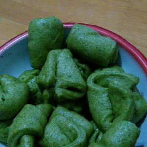 除了酵母外,其他材料加入菠菜泥,和面,最后加入酵母,继续揉,三光后静置发酵。盆光,手光,面团光~~~