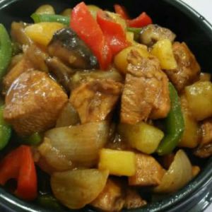 炒至洋葱和香菇变软,鸡块连腌制汁一同倒入,一起翻炒