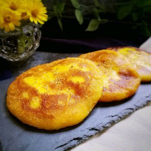 直到能用铲子轻轻推动饼胚,就翻面煎。过程中要翻面几次,直到两面金黄,中心熟透。