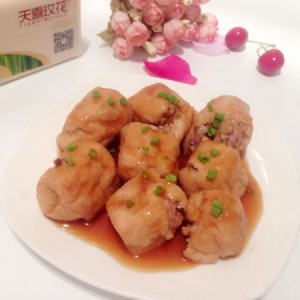 将油豆腐撕开一个口子,把肉末塞入里边。