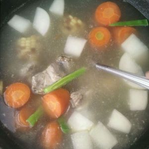 玉米,白萝卜,胡萝卜,排骨冷水下锅,倒料酒,姜,葱