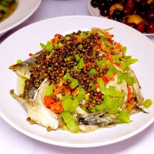 铺上辣椒上撒上盐和酱油料酒腌制一会,然后上锅蒸蒸熟