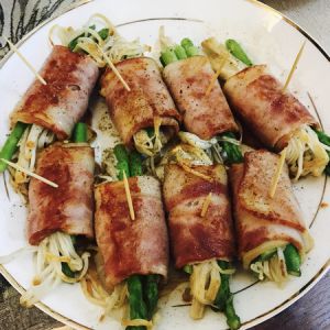 用培根将芦笋和金针菇卷起,用牙签固定。
