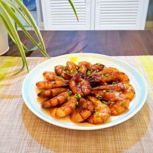 炒至虾变红蜷起时放入盐、糖、醋、红烧酱油和料酒,翻炒均匀。