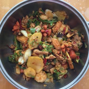 翻炒出香味后依次将不容易熟的菜品倒进去,翻炒,茼蒿白菜等易熟的菜品应在最后放入,加入料酒生抽老抽等,将有些菜品的水分炒干后,翻炒至菜品出锅。最后炒完如上图所示,味道还不错哟。