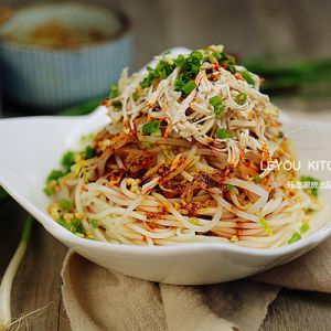 把面条控干水份,放到一个大盘中,然后放入2勺熟油,再用筷子挑散。(挑的时候,还可以用风扇吹一下,效果更好哦。)