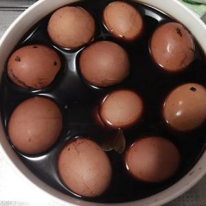加人花椒适量、茶叶适量(我用的是普洱)、香叶一片半、大料一个、小茴香适量、盐、鸡精、生抽、老抽、蚝油、美极鲜适量