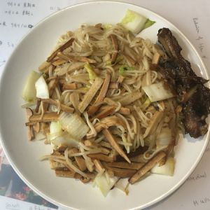 配料断生后放入过完凉水的面条,炒均匀后可以再选择加一勺酱油或者少许盐调味调色。