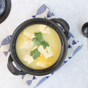 连鱼带汤一起倒入砂锅内小火慢炖直至鱼汤变白,加入切好的豆腐,加入适量的盐调味,炖至豆腐熟透即可