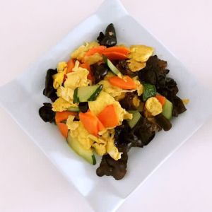 锅内放少许底油,放入黄瓜,木耳,胡萝卜翻炒一到两分钟后,放入炒熟的鸡蛋
