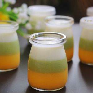 彩虹布丁做法同上,只是分三次搅拌布丁粉,每次37克,加入开水225克搅拌均匀后乘热装入布丁瓶中,约三分之一的高度即可。待凉冰箱冷藏半小时后再进行下一种布丁的操作,直到三色布丁全部完成