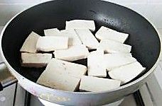 锅中倒油烧热,再放入豆腐片煎至两面金黄,盛出