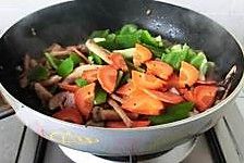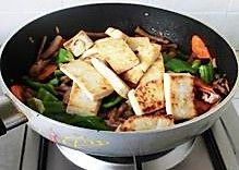 先爆香姜,放入茶树菇,再放入青椒、胡萝卜与豆腐一起拌炒均匀