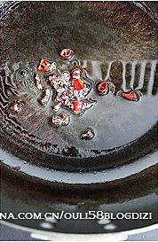 锅里放一勺油,将辣椒段和花椒放进去炸香