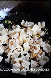 锅里加入半小勺辣椒粉,放入处理好的藕丁翻炒