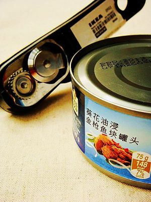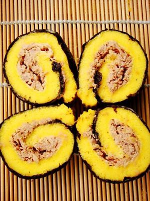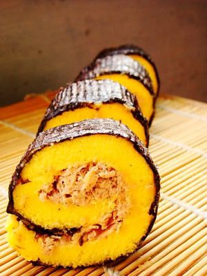 用手拎着油纸将蛋糕片拎出来放在烤网上,将油纸四边揭开散热。用抹刀将少许沙拉酱涂抹在蛋糕片的表面,涂得很薄,只要让蛋糕片表面湿润就可以了。将寿司用海苔片,裁剪至和蛋糕片一样的大小,粘贴在蛋糕片上。将寿司卷帘放在海苔片上。一只手轻压在卷帘上,另一只手放在烤网下方,两手翻转,使卷帘这面朝下放在桌面上。撤去烤网,撕去烤纸。在蛋糕片上涂上稍厚的色拉酱,均匀的铺上金枪鱼肉。从寿司卷帘的一端开始卷蛋糕卷,稍微用些力。顺着卷帘的纹理将蛋糕卷至最后,一边卷,一边将前端的卷帘退出来,卷好后,顺势将退出来的卷帘包住整个蛋糕卷。将卷好的蛋糕卷放在冰箱冷藏室内20分钟左右定型。食用的时候取出,撤掉卷帘,切块食用。