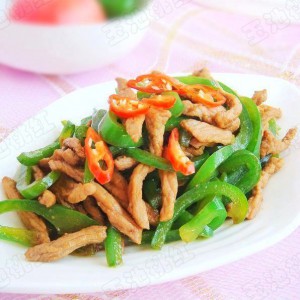 将青椒去蒂切条;瘦肉切丝,用生粉、生抽、料酒拌匀;
