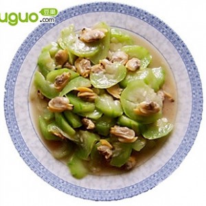 花蛤用清水搓洗干净。丝瓜削去外皮,冲洗干净后切成滚刀块。大葱切成细丝。