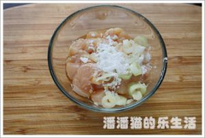 鸡肉切成块放入料酒、淀粉腌制十分钟。