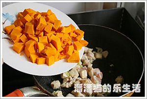 起锅做油,油热后滑入腌制好的鸡肉翻炒,鸡肉泛白后下入南瓜块继续翻炒5分钟。