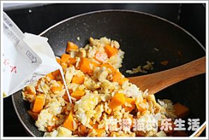 饭炒散后倒入牛奶中小火炖5分钟,放入牛奶后容易糊底,要不断翻炒。