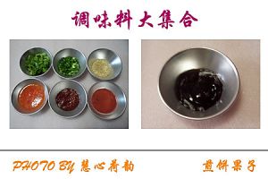 最后来个调味料大集合,油炸辣椒、腐乳汁水、蒜蓉辣椒酱、甜面酱、小葱、香菜、白芝麻,七种调料一样都不少,阿姨告诉我这就是最正宗的煎饼果子的调味料~